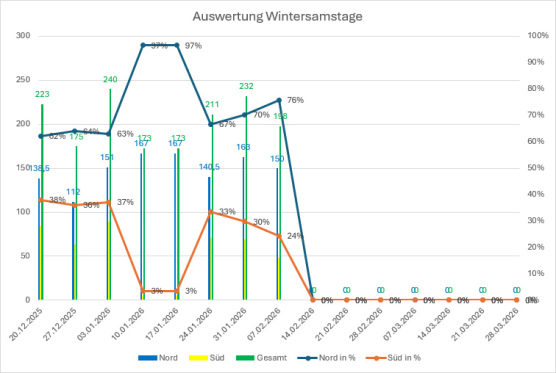 Es war zwischen dem Samstag 20.12.2025 bis einschließlich Samstag 07.02.2026 wieder viel los über unseren Köpfen. Flugzeuge im Minutentakt über Freilassing und das im Gegenverkehr. Am 10.01. und am 17.01.2026 wurden sogar 97% (!!) der Landungen UND Starts über den Norden abgewickelt. Für uns Betroffene ist das wieder ein sehr negativer Rekordwert. Das setzt sich am 03.01.2026 mit 63% Flugbewegungen über den Norden und am 31.01.2026 mit 70% Landungen und Starts über unseren Köpfen fort. Es ist nur ein Vorgeschmack auf die kommenden Wochenenden 14.02 und 21.02.2026 mit über 300 Flugbewegungen pro Tag! Damit hat der „Gegenverkehr“ im Flugverkehr über Bayern die Kapazitätsgrenze erreicht. Wir werden beobachten, ob es, wie im Vorjahr, zu einer Aufteilung nahe der von uns angestrebten 50:50 Lösung kommt. Im Norden war nicht mehr genug Platz vorhanden. 50% der Flugbewegungen erfolgten über den Norden und 50% über den Süden. Weil es es anders nicht mehr ging. Wir fordern daher, dass diese gerechte Aufteilung auch bei weniger Verkehr eingehalten werden muss! Hier noch eine Darstellung der Flugsamstage 20.12.2025-07.02.2026. Es handelt sich dabei um alle Flugbewegungen und nicht nur die instrumentengestützten.